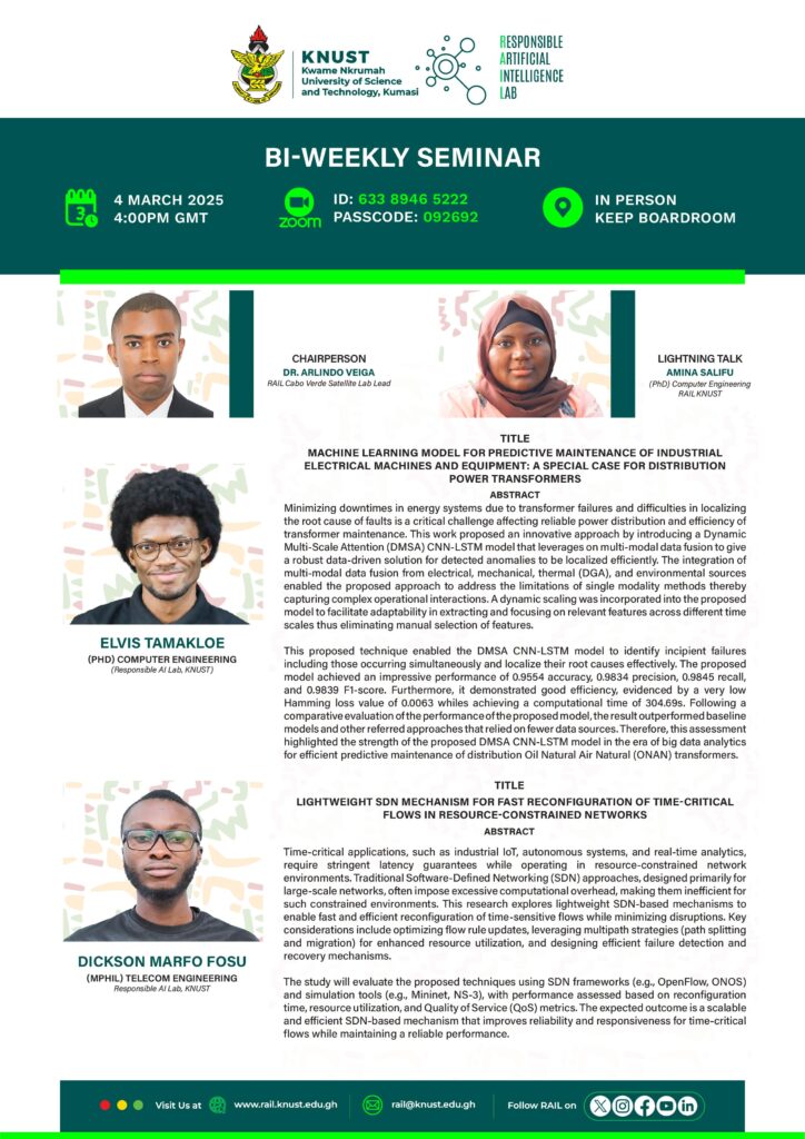 Dr. Arlindo Veiga, the Cabo Verde Satellite Lab Lead for the Responsible AI Lab (RAIL), embarked on a working visit to RAIL at the Kwame Nkrumah University of Science and Technology (KNUST) from 17th February to 8th March 2025. The visit reinforced academic and research collaboration between the two institutions while fostering knowledge exchange in Artificial Intelligence (AI) and Machine Learning (ML).