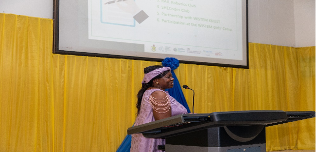 Dr. Akyereko Adjei emphasised RAIL’s mission to promote the responsible use and deployment of inclusive AI solutions to advance Africans’ contribution to the fourth industrial revolution as well as achieving the Sustainable Development Goals (SDGs). She highlighted the seven research themes under the Lab and elaborated on the various initiatives undertaken by the Women in Technology team. These initiatives include Innovation Challenges targeted at women innovators to foster creativity and problem-solving, SHECodes Programmes organised for female students at KNUST to enhance their coding skills and the Pre-tertiary Digitalization Outreach (PreDO) Program conducted in various Senior High Schools, where students are introduced to robotics and AI programming.